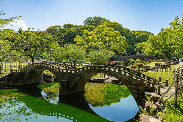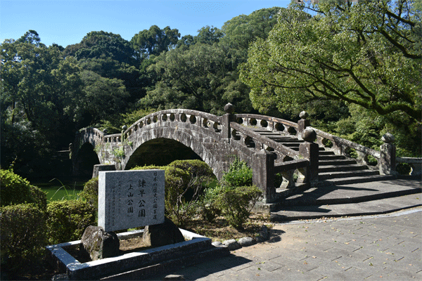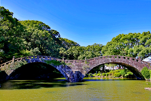 緑豊かな諫早公園の池に架けられた眼鏡橋は、ゆるやかな曲線が美しい階段式の石造り二連アーチ橋で、JR諫早駅から本明川沿いを歩いて約15分で行ける人気の観光スポットです。