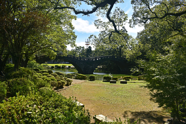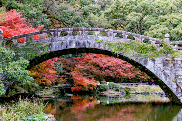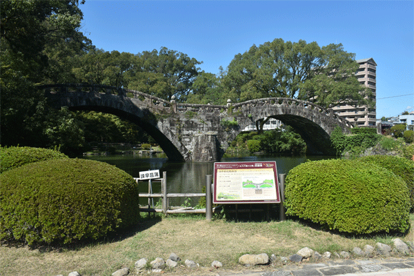 園内入口には、国指定重要文化財に指定された石造り二連アーチ橋の眼鏡橋を見ることができます。