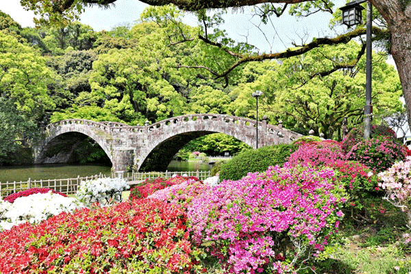 毎年4月中旬~5月上旬になると、眼鏡橋の池のほとりに咲く赤やピンクに白など、約3000本のツツジが見ごろを迎えます。