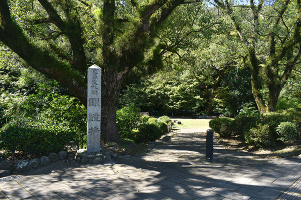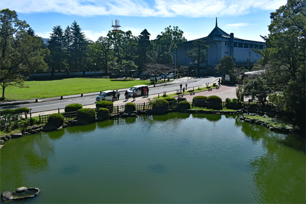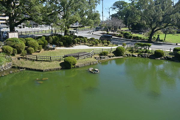 道路の向こう側に位置する県立諫早高校の裏門近くの「高城回廊」を進んで行くと、初代諫早領主龍造寺家晴によって築造されたと言われる、桃山様式の池泉回遊式庭園「御書院」があります。