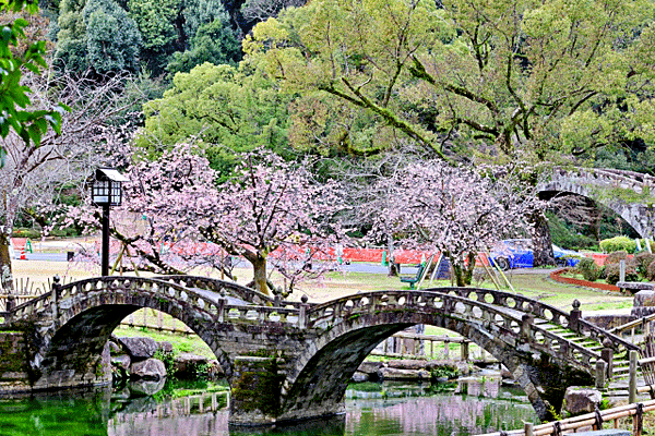 日本で最初に国指定重要文化財に指定された2連アーチ橋の眼鏡橋は、1839年(天保10年)に、本明川にかけられたものが水害の後に、長崎県諫早市高城町の諫早公園内に移設されました。