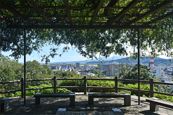 諫早公園の眼鏡橋を渡って、上山の山頂まで石段を上がって行った小高い場所に、藤棚がある展望所があります。
