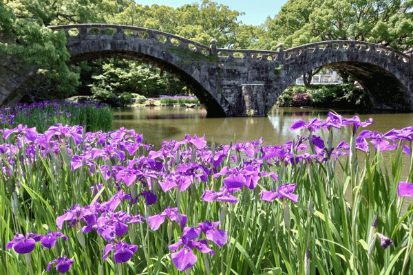 毎年5月下旬~6月上旬になると、眼鏡橋の池のほとりに咲く紫色の花菖蒲が見ごろを迎えます。