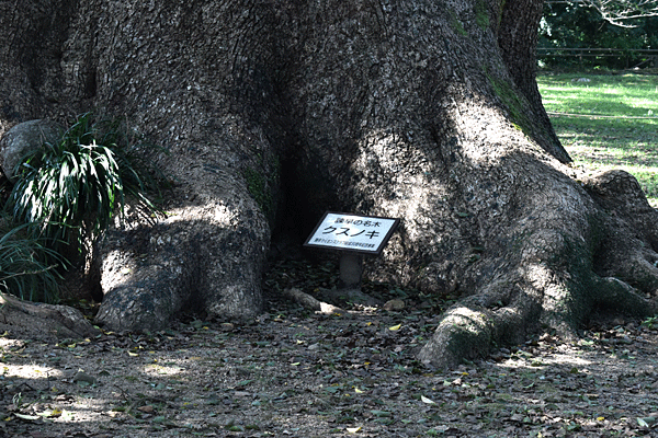 大クスの周りには柵があるため木の根元まで近づくことは出来ませんが、カメラの望遠で木の根元を確認してみると、樹名板には「諫早の名木・クスノキ」と記されていました。